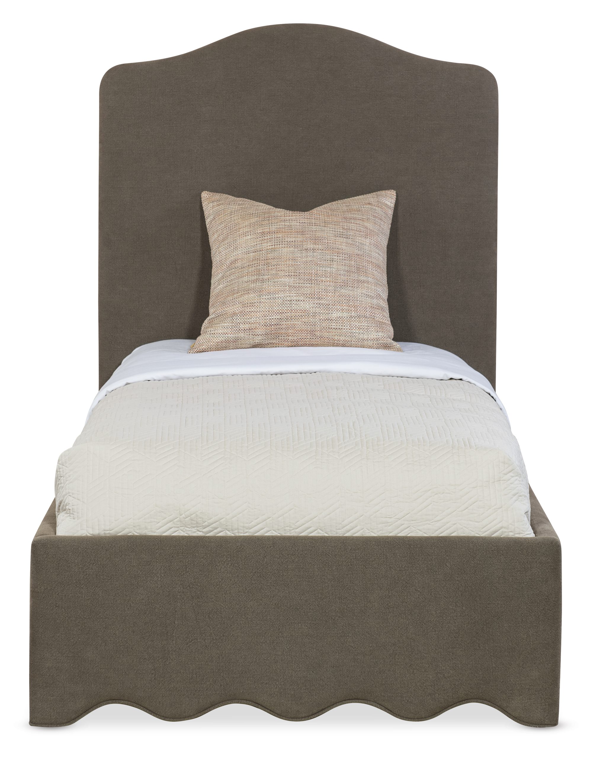 A warm twin upholstered bed in 100% linen (Broadway Coffee) featuring a fully fabric-wrapped frame and scalloped base for vintage-inspired charm. Includes headboard, footboard, and rails.