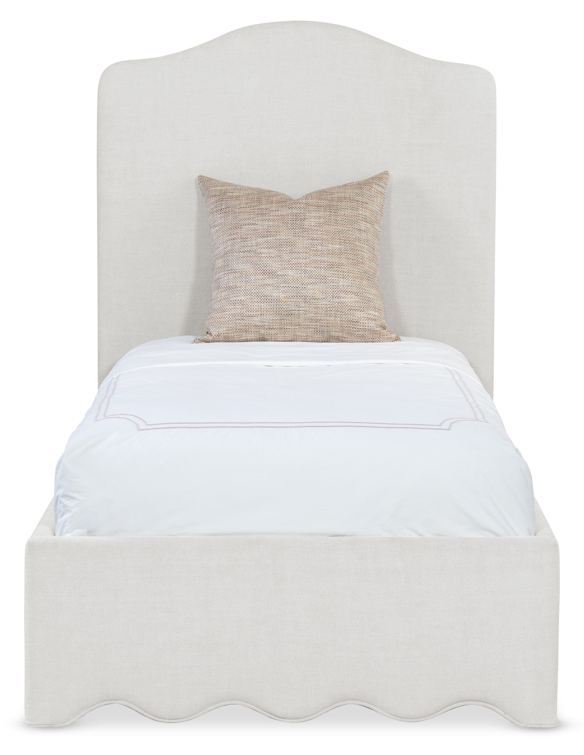 A twin upholstered bed in 100% linen (Broadway Dune) with a fully upholstered frame and scalloped base for timeless, traditional style. Includes headboard, footboard, and rails.