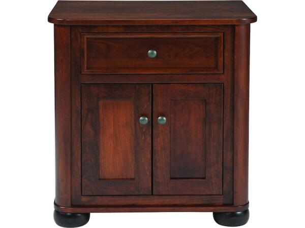 Artfully combining textures and tones, the Escape Bedside Table with Stone Top features one storage drawer, an open-air display shelf, and relaxed linear detailing.