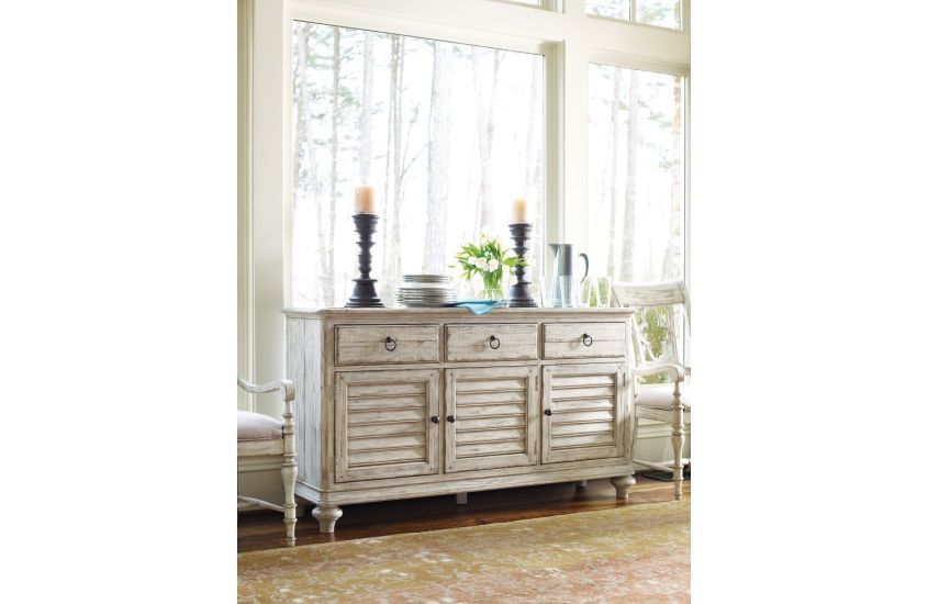 Hastings Buffet There are a few things to know about the the Hastings Buffet. First, the louver styled doors, are fixed so dust cannot get through any openings. And secondly, it is the one piece in the Weatherford collection that is fully the Cornsilk finish, and not two-toned with the Heather finish on the top. This allows it to work great as a correlating side piece or in conjunction with the Hastings Open Hutch deck. Inspired by the casual surroundings of the American farmhouse, Kincaid’s Weatherford collection blends timeless simple style with exceptional craftsmanship. Weatherford is a Kincaid original and is made from solid New Zealand Pine. It takes a number of design and construction techniques from the early wood workers. One example is the uneven board lay-up that shows off the individual pieces of solid wood that make up each part of the furniture Three door three drawers three adjustable shelves adjustable levelers New Zealand Pine DIMENSIONS: Height: 36 Width: 64 Length: 18
