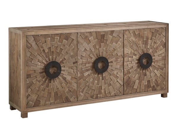 Bring sunshine and great design into your home when you chose this beauty for your stylish interior. The cool gray finish is enhanced by the warm brass inlaid sun rays, stunning circular pulls and framing on the doors. This chest also provides ample practical storage, with a removable shelf behind each pair of doors.